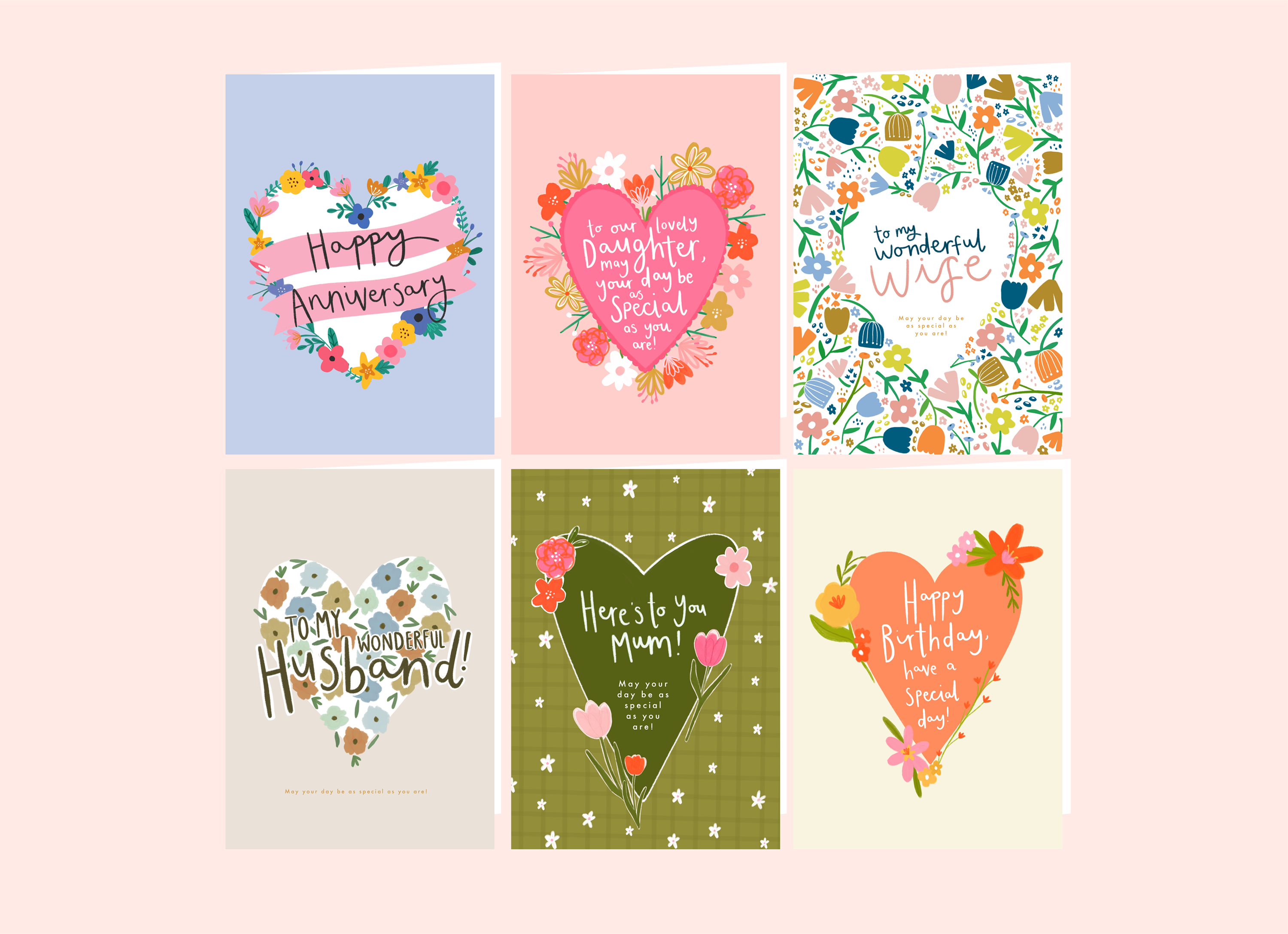 Brief : create birthday cards featuring floral hearts and the supplied phrases, all in different colourways