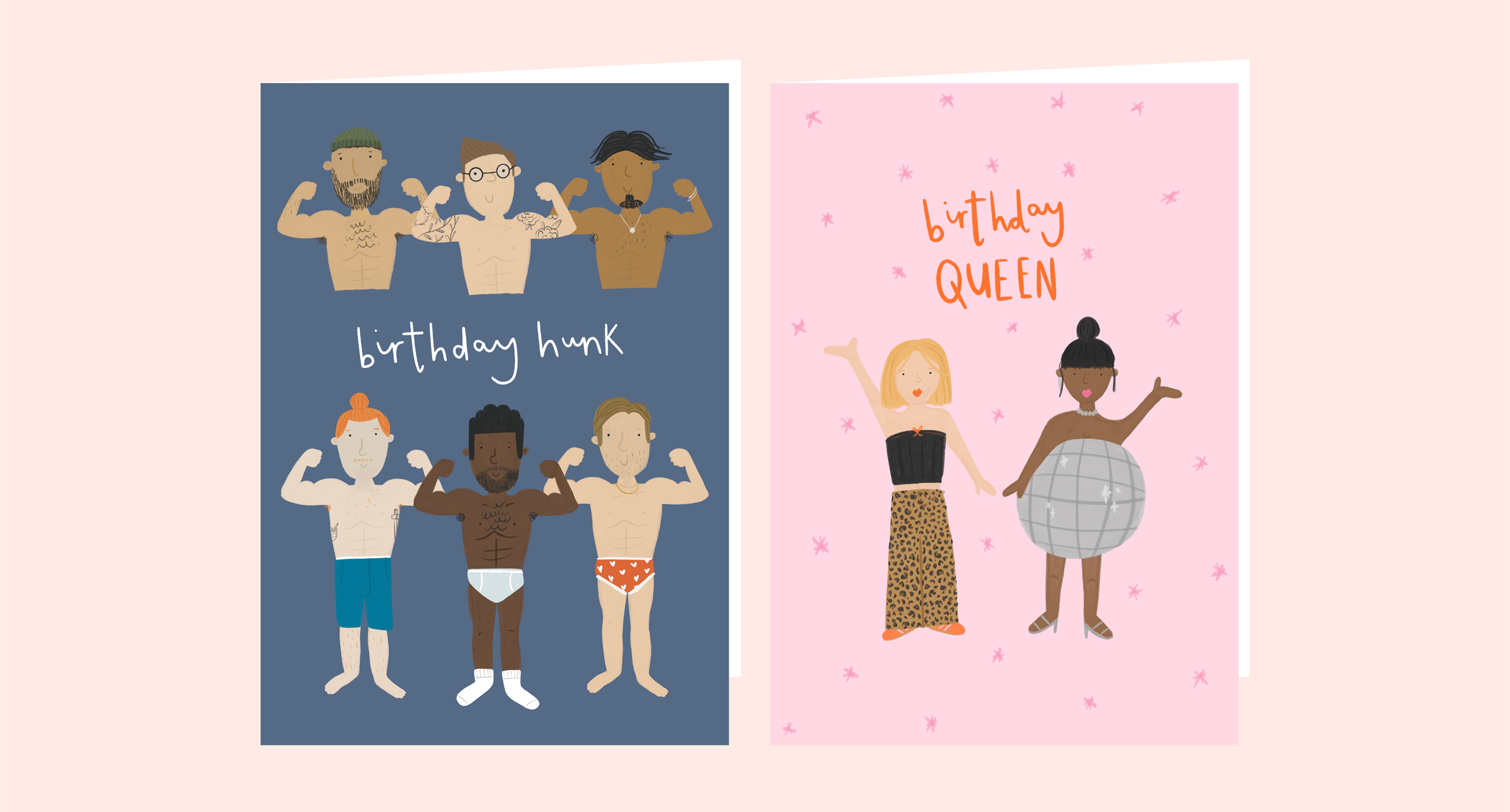 Brief : create birthday cards featuring illustrations of people, and the phrases 'Birthday Hunk' & 'Birthday Queen'