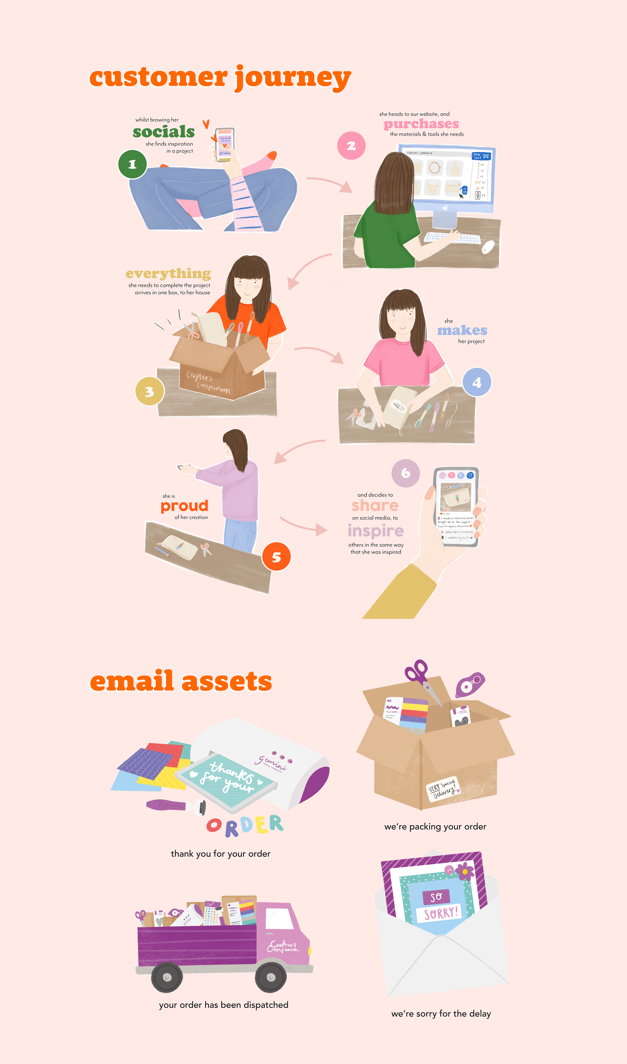 Two projects: bespoke illustrations developed for a corporate presentation, and a standalone set of marketing assets created for transactional customer emails.